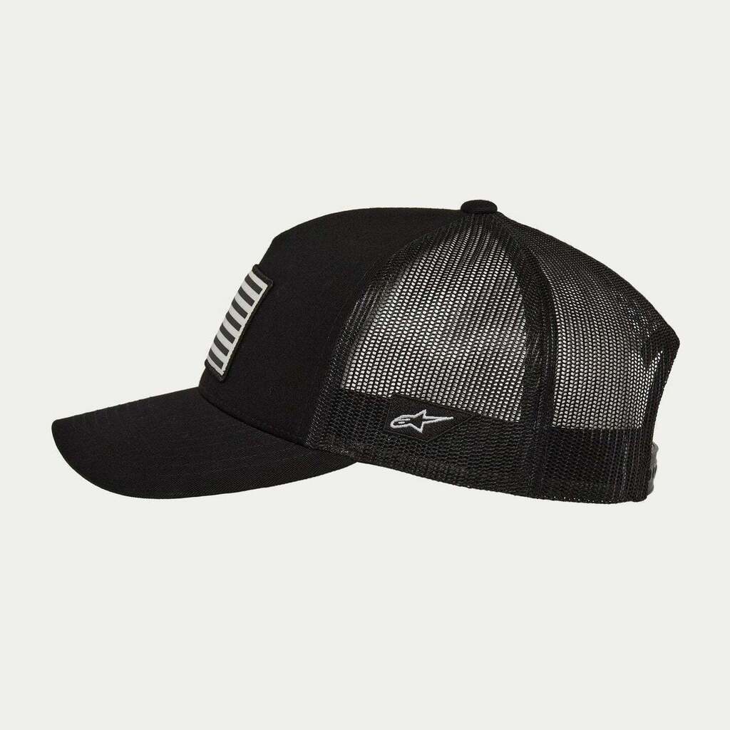 Incluye un patch estampado en el frente, logo bordado plano en el lateral, y etiquetas internas, resaltando el ADN premium de Alpinestars.